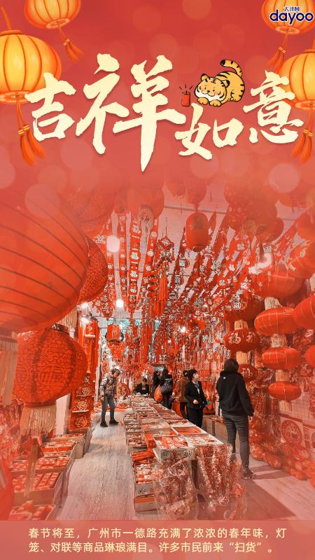 再过几天就要过年了,此刻的你是已经踏上归途,还是在岗位上继续坚守?小年一过,农历新年的氛围愈加浓厚,街道两旁挂起大红灯笼,年货街摆满了红红火火的装饰品,街坊们精心挑选靓丽的年花,当你在广州看到这些的时候,就是要过年了!你眼中的广州年味是怎样的?请收下这份年味满满的新春祝福,愿你虎年虎虎生威!