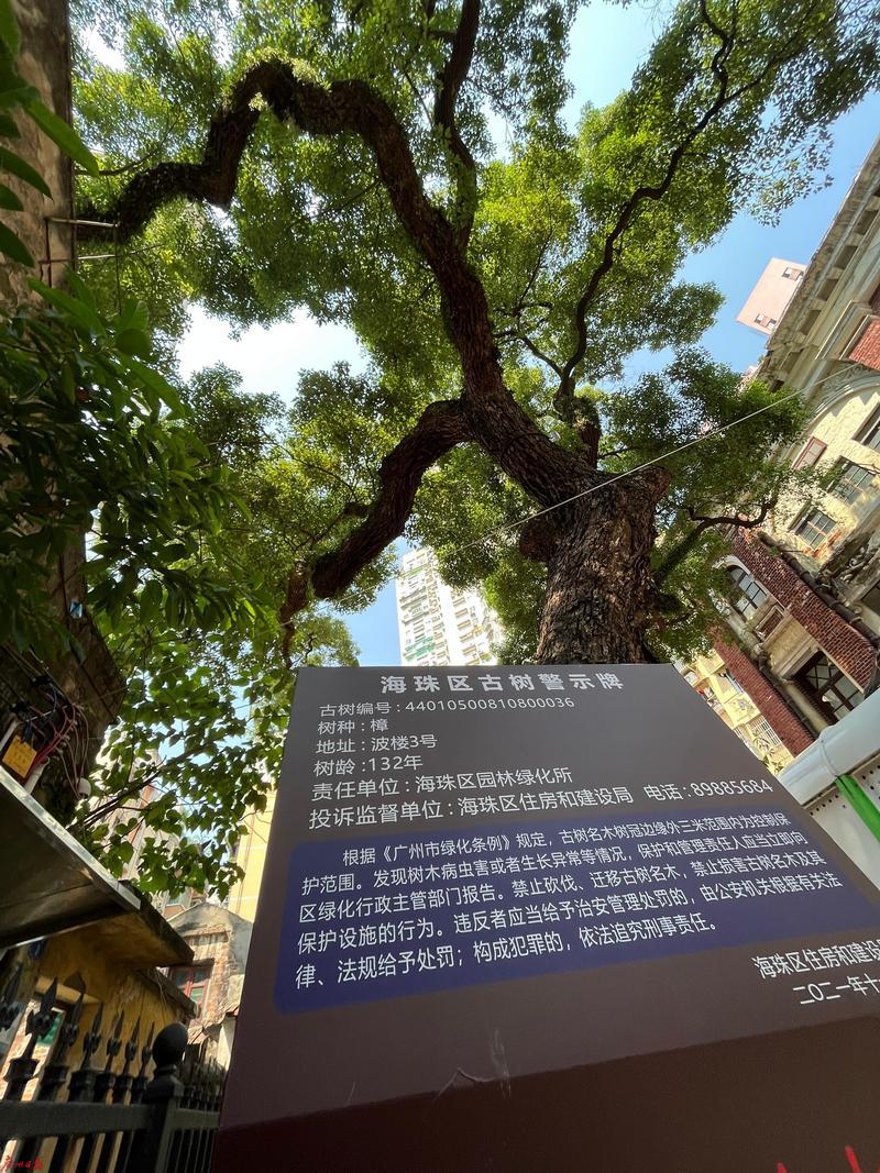 133岁,在广州市海珠区的古树名木中,这株位于波楼3号的樟树只能算是小字辈。然而,它所身处的位置注定了它的不凡。波楼是广州市第六批文物保护单位,早在十几年前,记者就曾慕名来洲头咀寻访过。