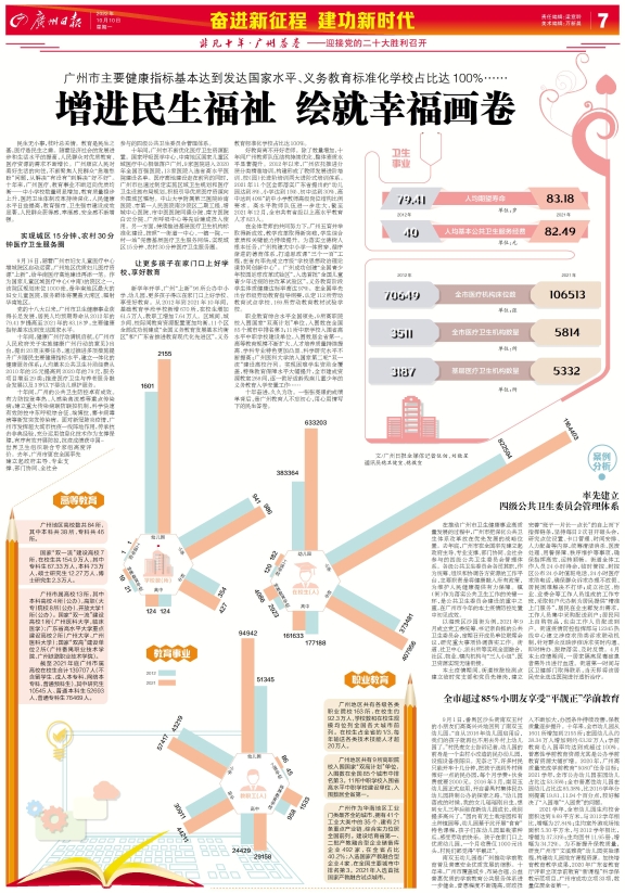大洋网讯 民生无小事,枝叶总关情。教育是民生之基,医疗是民生之需。随着经济社会的发展进步和生活水平的提高,人民群众对优质教育、医疗资源的需求不断增长。广州顺应人民对美好生活的向往,不断聚焦人民群众“急难愁盼”问题,从解决“有没有”到解决“好不好”。十年来,广州医疗、教育事业不断迈向优质均衡——中小学校数量明显增加,教育质量稳步上升,医药卫生体制改革持续深化,人民健康水平日益提高,教育强市、卫生强市建设成效显著,人民群众获得感、幸福感、安全感不断增强。