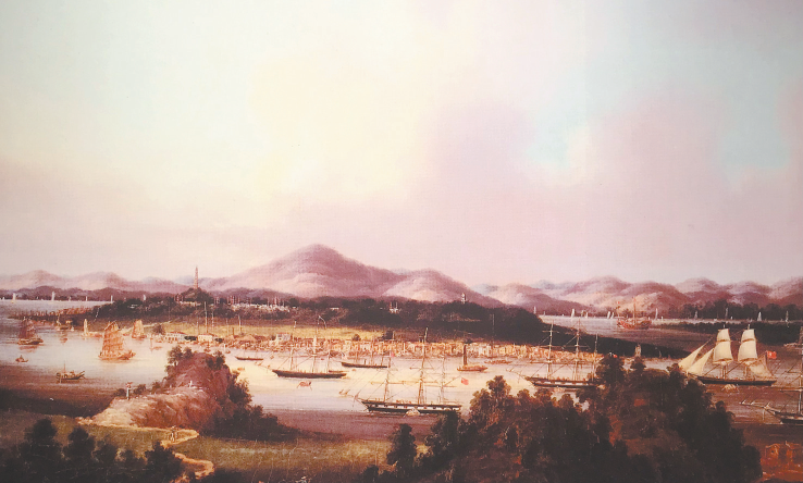 ↑19世纪50年代的长洲岛,近处为柯拜船坞。(翻拍)中船黄埔文冲船舶供图