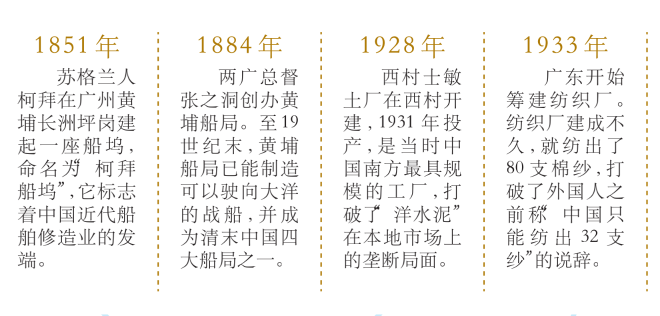 柯拜船坞为广州近代工业开了个头。20多年后,清廷内部的洋务派主张学习西方先进技术,以图“自强”“求富”。这一时期,广州工业取得了前所未有的成绩。