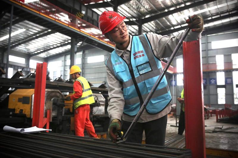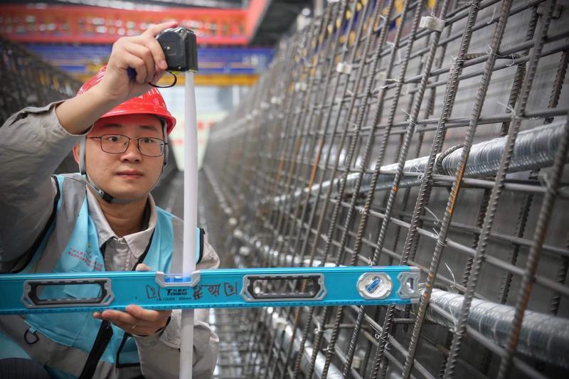 “我们先对不同种类的钢筋半成品进行抽检,随后,对胎架上经绑扎后的底腹板和顶板钢筋的钢筋间距、型号尺寸进行检查,合格率均超过90%方可进行下一步工序。”孙一方告诉记者,广州交投集团引入智能数控设备加工钢筋,不仅实现标准化生产,还将钢筋的加工精度提升到毫米级。随后,经检验合格后的底腹板和顶板钢筋骨架会被吊至液压钢模板内。入模前,孙一方会使用水平尺和钢尺对液压钢模板楔形块、防错台等进行严格的检查;入模后,他也会对它的入模安装及梁长尺寸等进行仔细的检查。这时,他的工具也会“升级”:“有时会用5米卷尺、有时会用50米卷尺。”