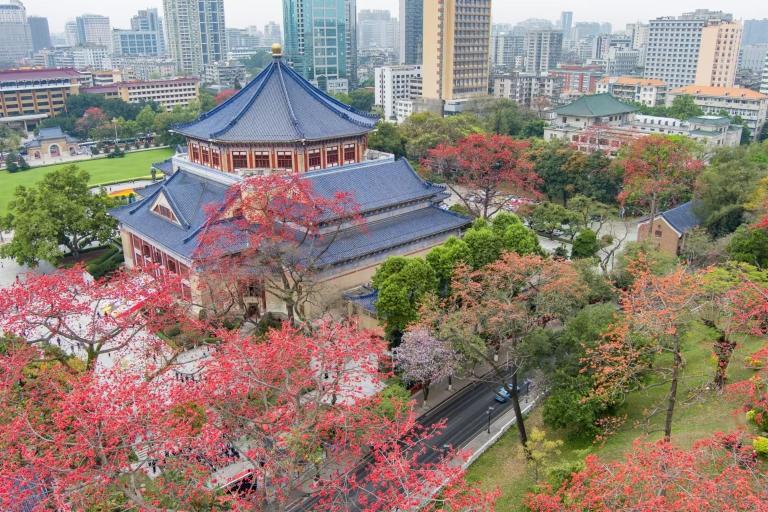 广州中山纪念堂作为广州最多古老木棉树的公园之一,园区内共有29株木棉,其中“木棉王”如今已有350多岁高龄。木棉王周边,是全园木棉树冠覆盖最密集的区域,每到木棉盛开的季节,“几树半天红似染”就是最形象的表述。除了这里有古老雄伟的“木棉王”和红盖蓝天的木棉花密度,还有一个原因是这里离中山纪念堂主体建筑距离最近,蓝瓦、黄墙、红花、隔窗、飘檐、悬枝,成为众多摄影爱好者热捧的最佳摄影地,更是每年游客最喜爱的打卡点。据专家预测,今年木棉王开花约在8万朵左右。