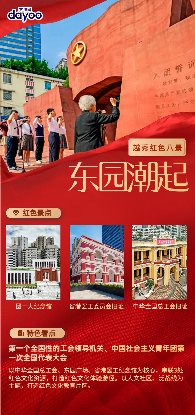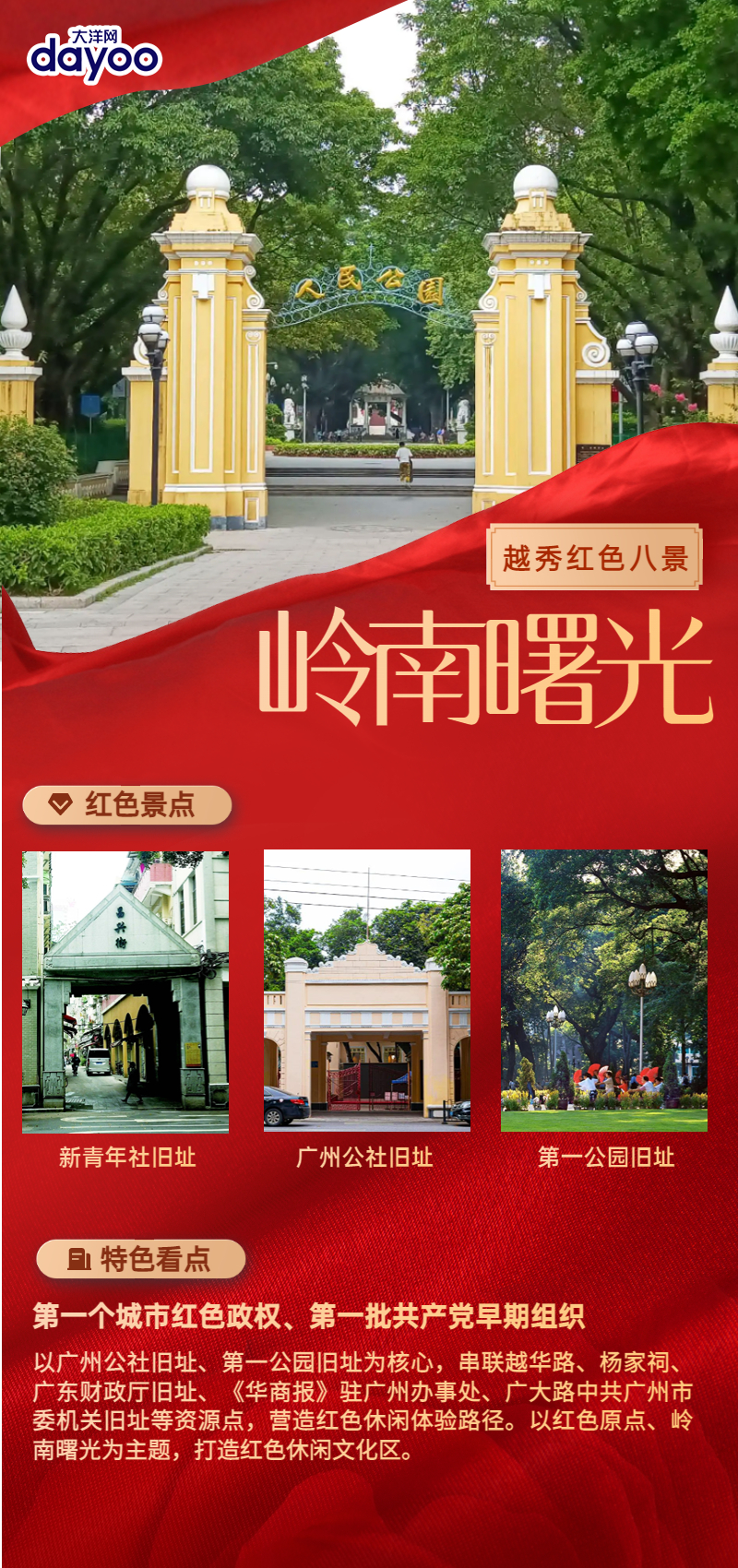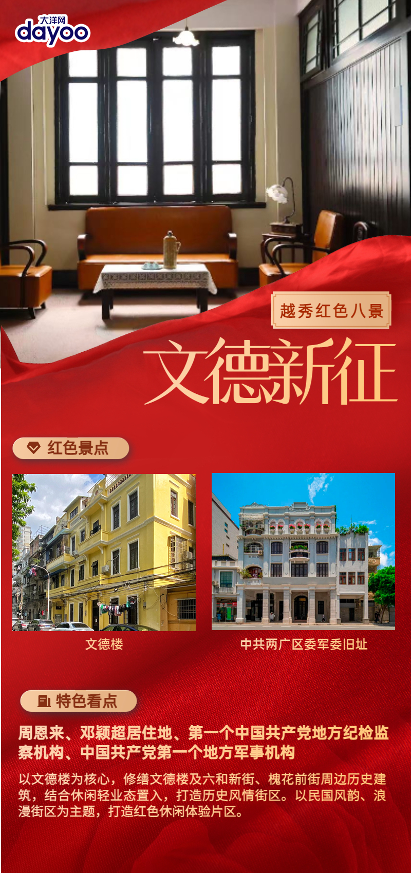 近日,越秀区对外发布“红色八景”名单,越秀红色八景以国内较高影响力的红色资源点为核心, 综合越秀地区中共党史上的十个“第一”、羊城十景等重要文化资源进行打造,8个关键词对应8大片区,每一处景观都绝美,包括河浦同舟、红墙求索、东园潮起、文德新征、红陵旭日、珠水丹心、长堤扬旗、岭南曙光。弘扬革命精神,传承红色基因,越秀红色八景你打卡了吗?