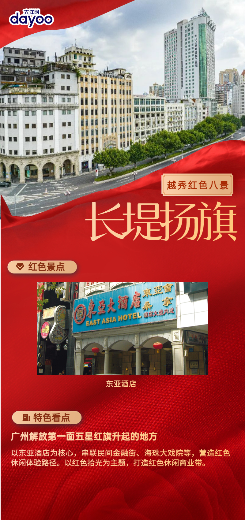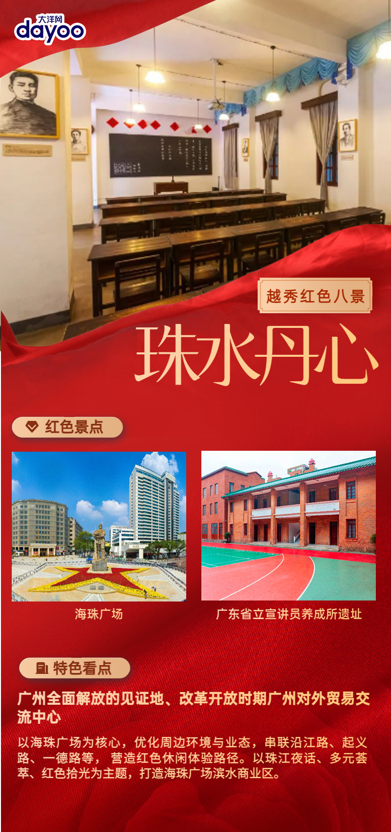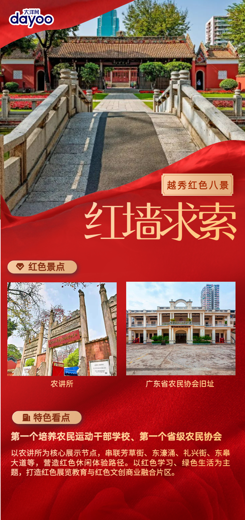 近日,越秀区对外发布“红色八景”名单,越秀红色八景以国内较高影响力的红色资源点为核心, 综合越秀地区中共党史上的十个“第一”、羊城十景等重要文化资源进行打造,8个关键词对应8大片区,每一处景观都绝美,包括河浦同舟、红墙求索、东园潮起、文德新征、红陵旭日、珠水丹心、长堤扬旗、岭南曙光。弘扬革命精神,传承红色基因,越秀红色八景你打卡了吗?