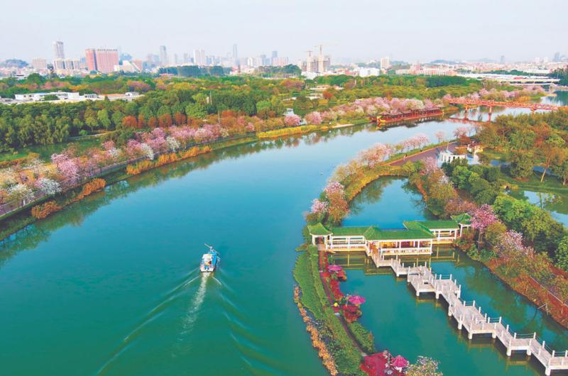羊城三月,繁花似锦。海珠湿地、花都湖的宫粉紫荆,中山纪念堂的木棉花,华南植物园里的禾雀花……一簇簇、一丛丛,开得绚烂、开得梦幻。与遍布全城的花海相得益彰的是头顶的蓝天、门前的绿水、林间的鸟鸣,近年来,广州深入践行习近平生态文明思想,坚持生态优先、绿色发展,努力构建绿美广州生态新格局,绘就人与自然和谐共生的壮美画卷。