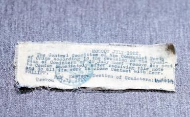 缝制在马林衬衣上的共产国际指令(原件藏于荷兰阿姆斯特丹国际社会史研究所)。 广州日报全媒体记者庄小龙 摄 白色绸缎上的指令内容翻译成中文为:“中国共产党中央委员会接此通知后,应据共产国际主席团7月18日决定,立即将驻地迁往广州,并与菲力浦同志密切配合进行党的一切工作。”