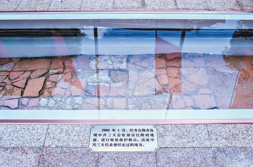 广场中间深红色石碑上,“中国共产党第三次全国代表大会会址”和“全中国国民革命者联合起来”两行大字简约庄重。石碑下方,是被玻璃覆盖的长方形凹槽,其下可见一些会址的建筑遗迹。其中,部分红阶砖地面进行了原址保护展示,这是中共三大代表曾经走过的地方。