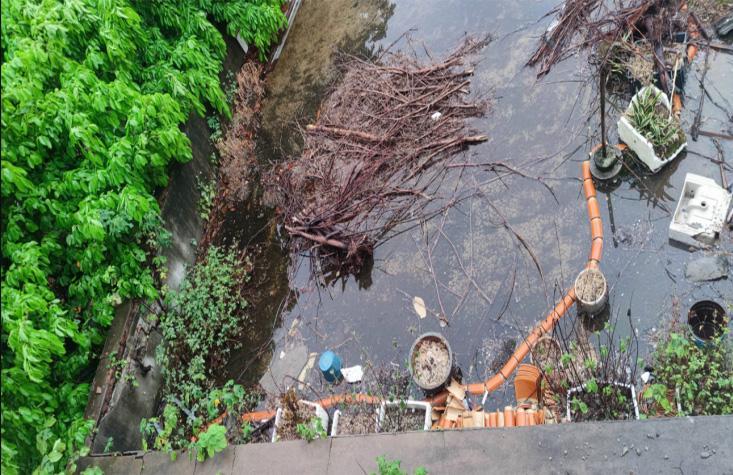 “第一次上天台吓了我一跳,一开门蚊子扑面而来,地上堆满了破花盆、碎砖等杂物,还有厚厚的一层残枝落叶。”苏文飞告诉记者。前几年,天台下水管道尚未完全堵死,虽然雨天后天台也会有积水,但是过一段时间后总会逐渐沥干。可由于物业疏于管理,随着时间推移,天台下水管道渐渐被完全堵死。
