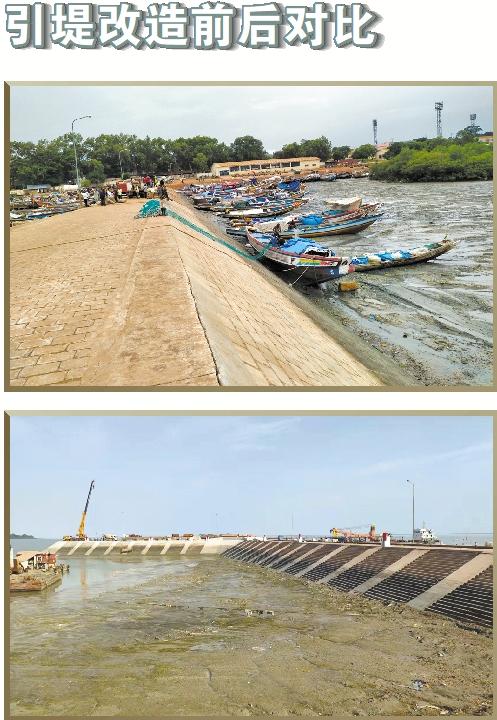 码头项目开工前,当地只有简陋的码头设施,可以停船的泊位很少,还有大片红树林和沼泽,船舶甚至不能完全靠岸。引堤护岸没有台阶,只有滑坡,渔船卸货时,一排人站在坡上,一个接一个地传递货物,稍有不慎就容易滑倒摔跤。