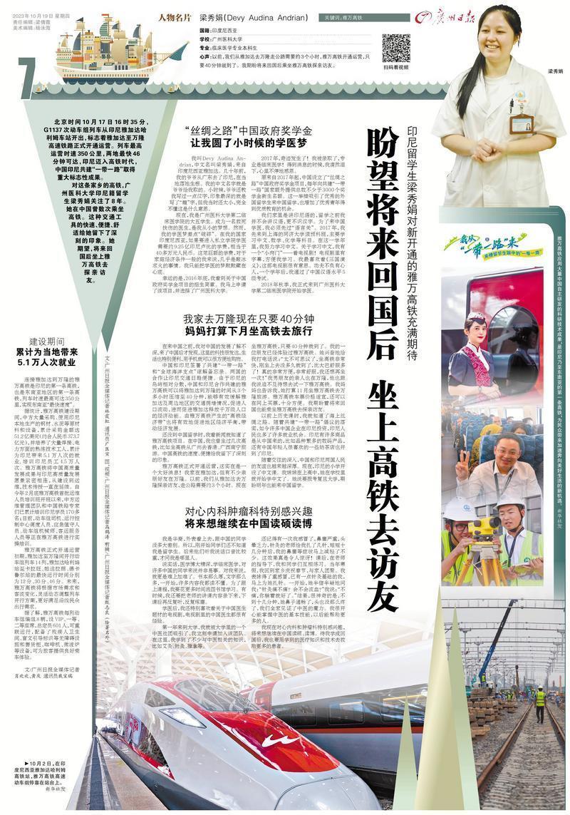 对这条家乡的高铁,广州医科大学印尼籍留学生梁秀娟关注了8年。她在中国曾数次乘坐高铁。这种交通工具的快速、便捷、舒适给她留下了深刻的印象。她期望,将来回国后坐上雅万高铁去探亲访友。