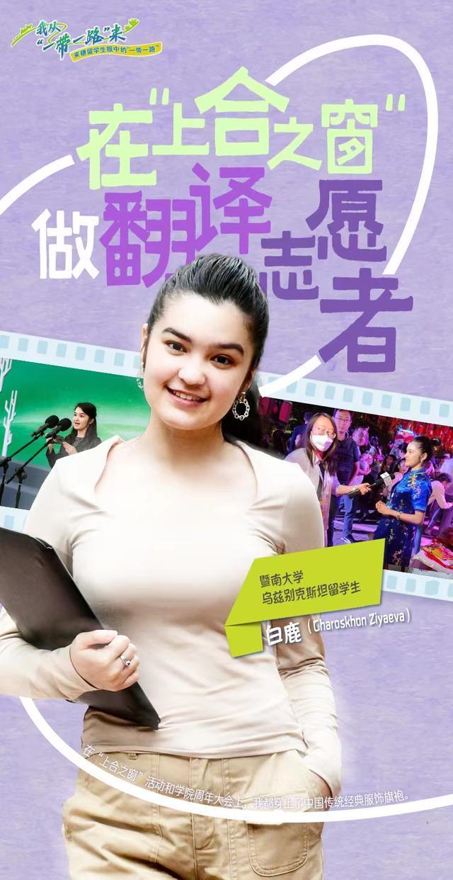 在近日举行的暨南大学华文学院/广州华侨学生补习学校成立70周年大会上,一位身穿蓝色旗袍、说着流利汉语的留学生的出现,让人眼前一亮,她就是暨南大学华文学院乌兹别克斯坦籍留学生白鹿(CharoskhonZiyaeva)。