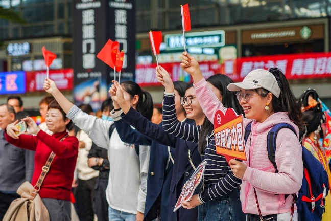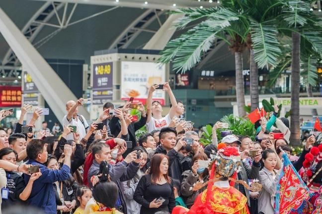 现场,不少乘客更是领取了现场派发的五星红旗,神采飞扬地随着节奏摇五星红旗,融入温馨的新年祝福氛围中。“令人心潮澎湃的仪式感”是许多驻足乘客反馈的第一印象。很少人知道,这场快闪背后的主题,恰恰就是“温情·归乡之路”。2022年,广州南站发送旅客总量以4770万人次居全国第一,成为全国最繁忙的火车站,从年头忙到年尾。每一年,人们从这里出发,前往远方,或在这里抵达广州,扎根于此,来来往往,背后是家乡的柔情,也有关于梦想,这里承载了无数人温情和归乡之路。在这条路上,家和国从来都是紧密的关联,每个人都期待着在繁荣昌盛之下,追逐美好而幸福的未来,并带给身边的家人。
