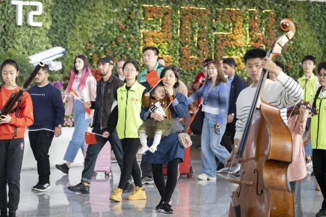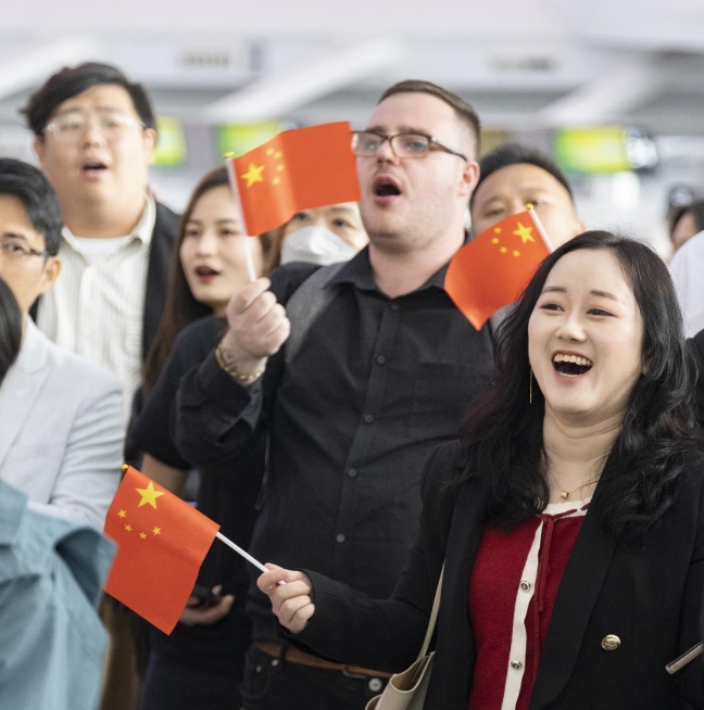 当《我爱你中国》歌声在白云机场响起时,熟悉的旋律唤起了现场观众内心深处的情感记忆,点燃了过往旅客的热情,驻足观看的旅客们挥舞着五星红旗,浓浓的爱国情和建功新时代的美好愿景伴随着饱含深情的歌声,回荡在航站楼内。