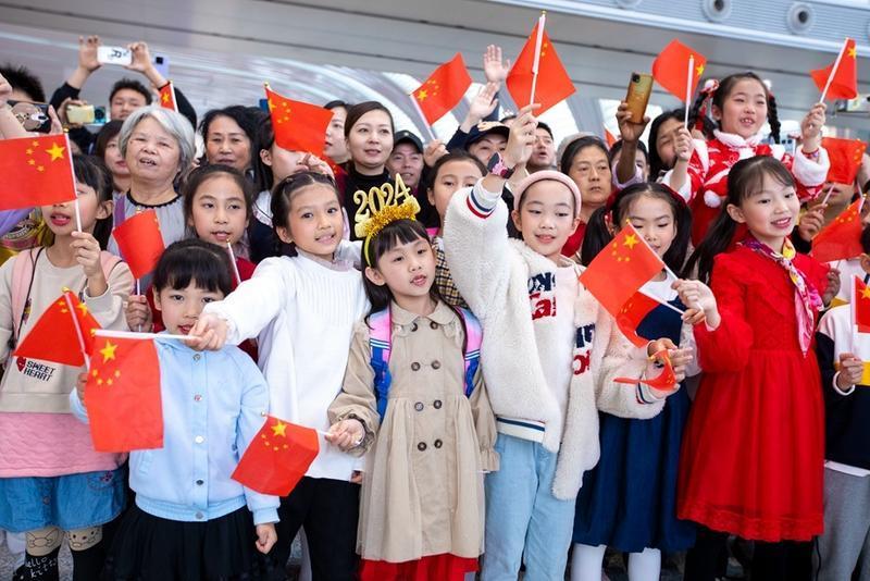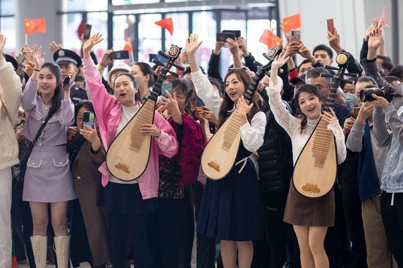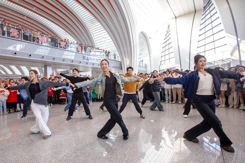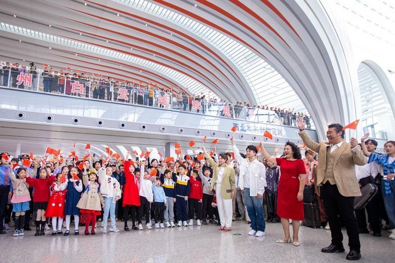 2024年1月1日上午,随着广州交响乐团女高音歌唱家崔峥嵘从人群中款款走出,一曲《我爱你中国》大合唱在广州白云站西北角大厅激情唱响。随即,青年男高音歌唱家张学樑、青年歌唱家冯珊珊和黄健明带领星海音乐学院师生、广州儿童合唱团的小朋友以及现场旅客纷纷加入。在广东音乐曲艺团曲艺演员们琵琶、笛子、高胡、二胡、唢呐等民族乐器的和鸣下,广州歌舞剧院的十余名舞蹈演员现场上演了一段融合了汕头特色英歌舞的街舞,青春洋溢,阳光向上。2024年的第一天,在新近落成的“超级车站”广州白云站内,一场别开生面的“快闪”活动给旅客带来了惊喜,也给今年喜迎75周年华诞的共和国送上了深情祝福。