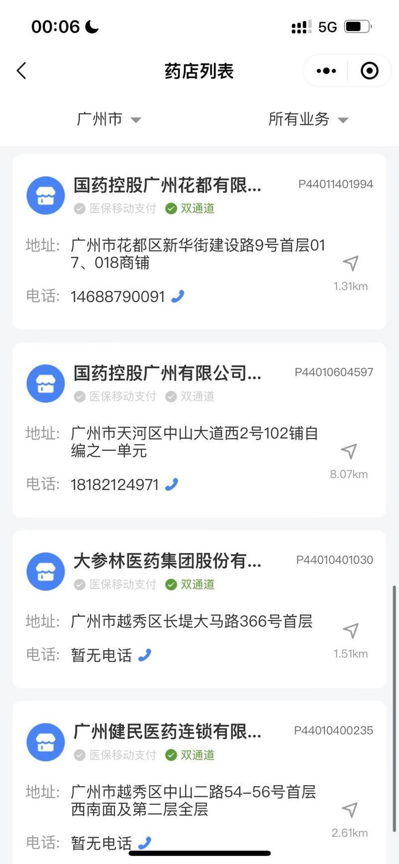 目前,全市共33家医院可根据诊疗需要,为广州街坊开具“双通道”药品外配处方,30家药店可以提供“双通道”药品的现场购药及医保报销服务(医药机构名单持续更新)。详细医药机构名单可通过以下路径查询:关注“广州医保”公众号—点击“走近医保”—“定点&药价”栏目—查看双通道定点医药机构名单。