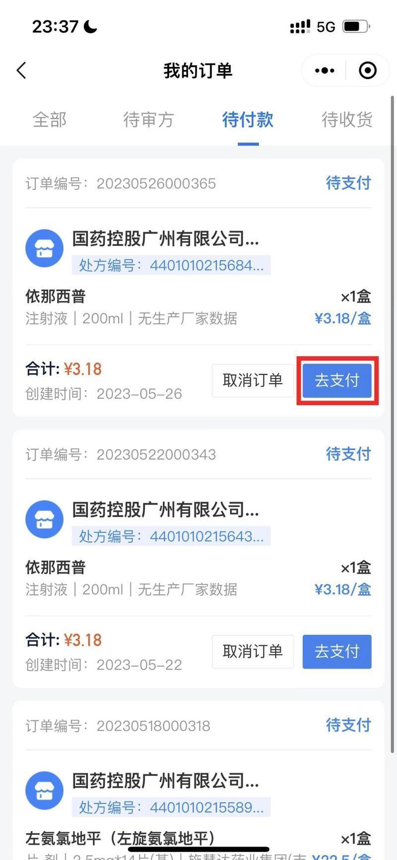 进入订单页,找到审核通过的处方,点击【去支付】。