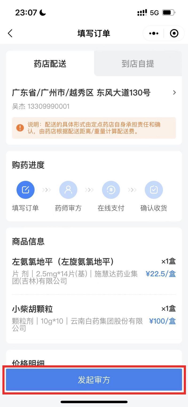 点击【在线支付购药】,进入【填写订单】页,可自主选择取货方式配送/自提,确认订单信息后,点击【发起审方】。