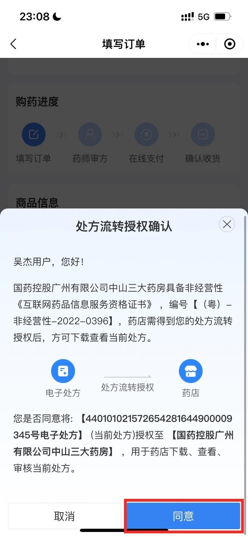 点击【同意授权】,授予药店处方查看权限,同时审方信息将发送至药店。