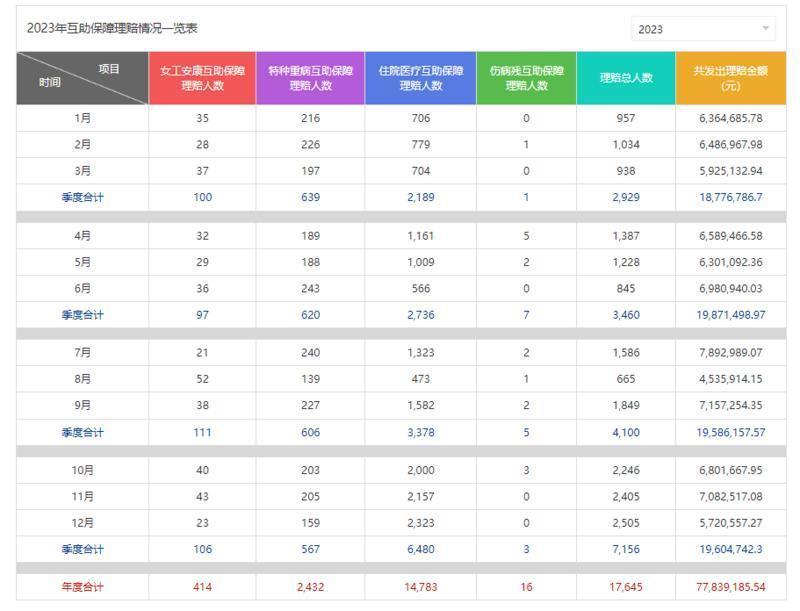 广州日报记者1月3日从广州市总工会官网获悉,广州市工会职工互助保障(女工安康互助保障、特种重病互助保障、住院医疗互助保障、伤病残互助保障)2023年理赔情况已出炉。2023年理赔情况显示,广州市工会职工互助保障2023年发出理赔金额77839185.54元;2023年理赔总人数为17645人,理赔总人数相比2022年增加4059人。