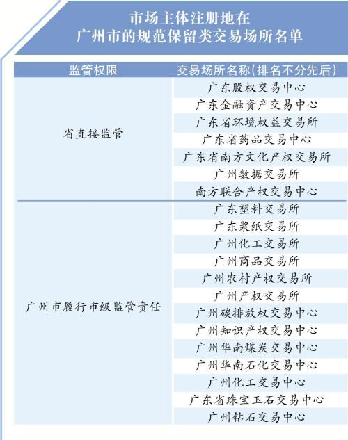 截至目前,市场主体注册地在广州市的规范保留类交易场所共计20家,其中13家交易场所由广州市履行市级监管责任,属于《实施意见》规范的对象。根据《实施意见》,市地方金融监管是全市交易场所监督管理的统筹协调部门,市国资委、市农业农村局分别监管广州产权交易所、广州农村产权交易所,广州碳排放权交易中心、广州知识产权交易中心、广州钻石交易中心、广东省珠宝玉石交易中心、广东塑料交易所、广州化工交易所、广州化工交易中心、广州商品交易所、广州华南煤炭交易中心、广东浆纸交易所、广州华南石化交易中心共11家交易场所由市地方金融监管局负责监管。