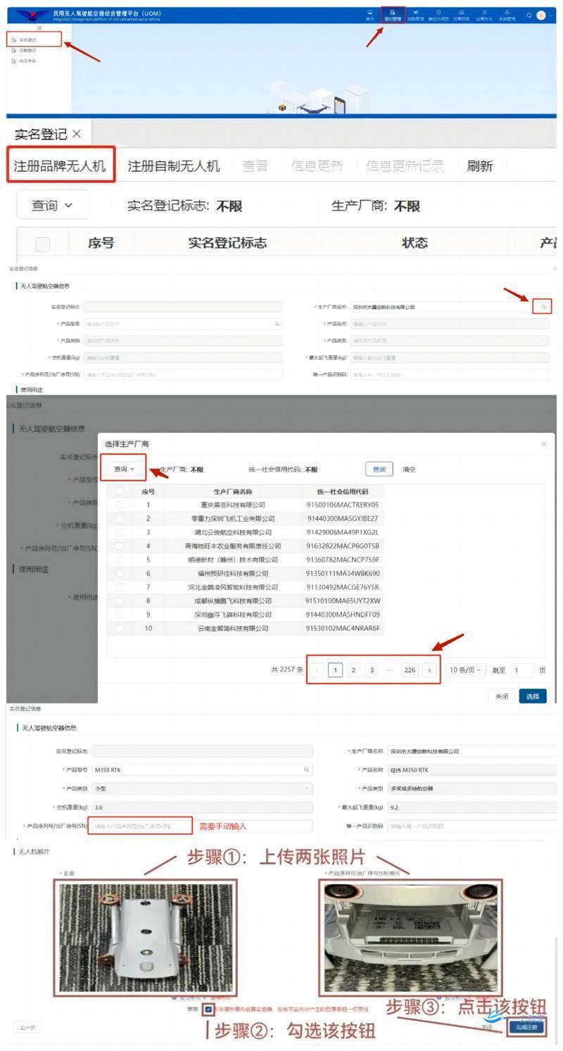 (二)实名注册无人机。登录后进入首页——点击右上角登记管理——实名登记——注册品牌无人机——验证所有人信息——手机扫码刷脸验证——选择生产商名称——选择型号等相关信息(序列号需手动输入)——根据要求长传照片——完成注册。