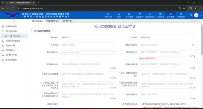 中国民航局2023年12月31日发布《关于民用无人驾驶航空器监管服务有关事宜的公告》,组织无人驾驶航空器的单位或个人,应当在拟飞行前1日12时前通过民用无人驾驶航空器综合管理平台(UOM)提出飞行活动申请。登录后进入首页——点击右上角运行管理——飞行活动申请——一般飞行活动。