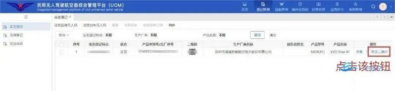 (三)完成注册后,可在实名登记页面中查询到已完成注册登记的无人机,点击右侧 “发送二维码”按钮,填写邮箱,下载附件并打印,将二维码粘贴至该无人机的机身上。