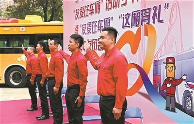 在“这厢有礼123工作法”发布活动上,公交司机们展示“友爱在车厢 真诚为乘客”等标语展板。