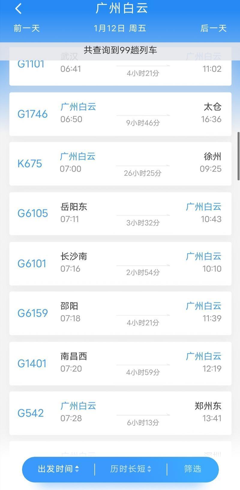记者查询12306网站发现,在1月10日之前,广州白云站每日开行列车最多只有十多趟,目的地以省内以及省外湖南长沙、张家界、岳阳等地为主。1月10日全国铁路调图后,广州白云站运力大增,1月10日开行列车达到80列。11日及之后更是每日开行列车97-99列,已经接近104列的图定最大运力。