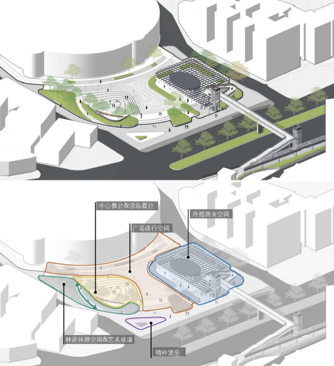包括太阳城广场、同泰路交通堵点。太阳城广场位于南方医院对面,由过街天桥连接。改造将其打造为片区门户广场,新设下沉式中心舞台,结合无障碍坡道设计台阶座椅,外围增加开花乔木等绿植,营造林荫休憩空间和艺术坡道。场地拟加入外摆商业空间,为市民提供多样消费体验。同泰路堵点改造采用广州大道快捷化系统改造的方案,新增双线四车道跨线桥。