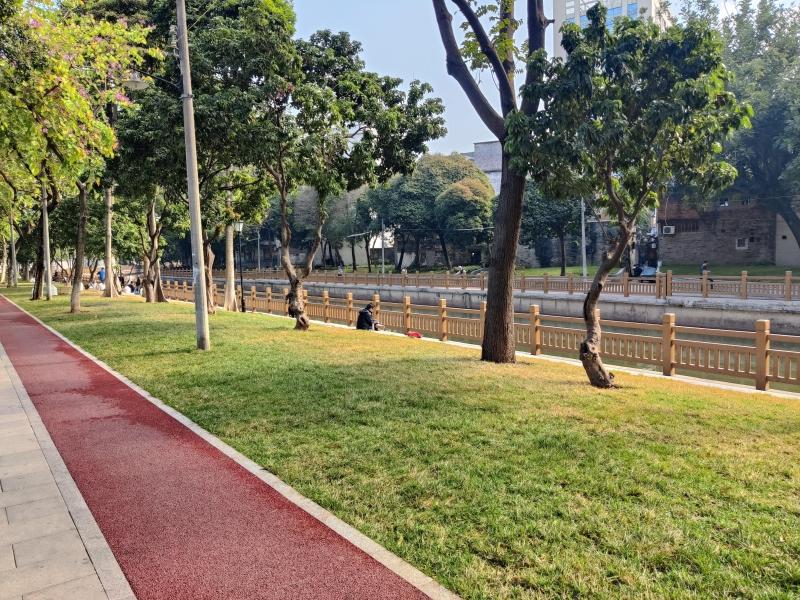 杜凡介绍,“这次改造,绿地上每一棵树都是原有的。”驷马涌沿岸原本植被密集,有荔枝树、紫荆树、凤凰木等大型乔木,此次涌边绿化提升对原有树木进行严格保护,主要采取“乔木+草坪”的种植模式,保留原有乔木,整理杂乱的灌木丛。