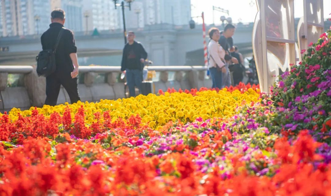 广州沿江西路的花坛鲜花盛开。
