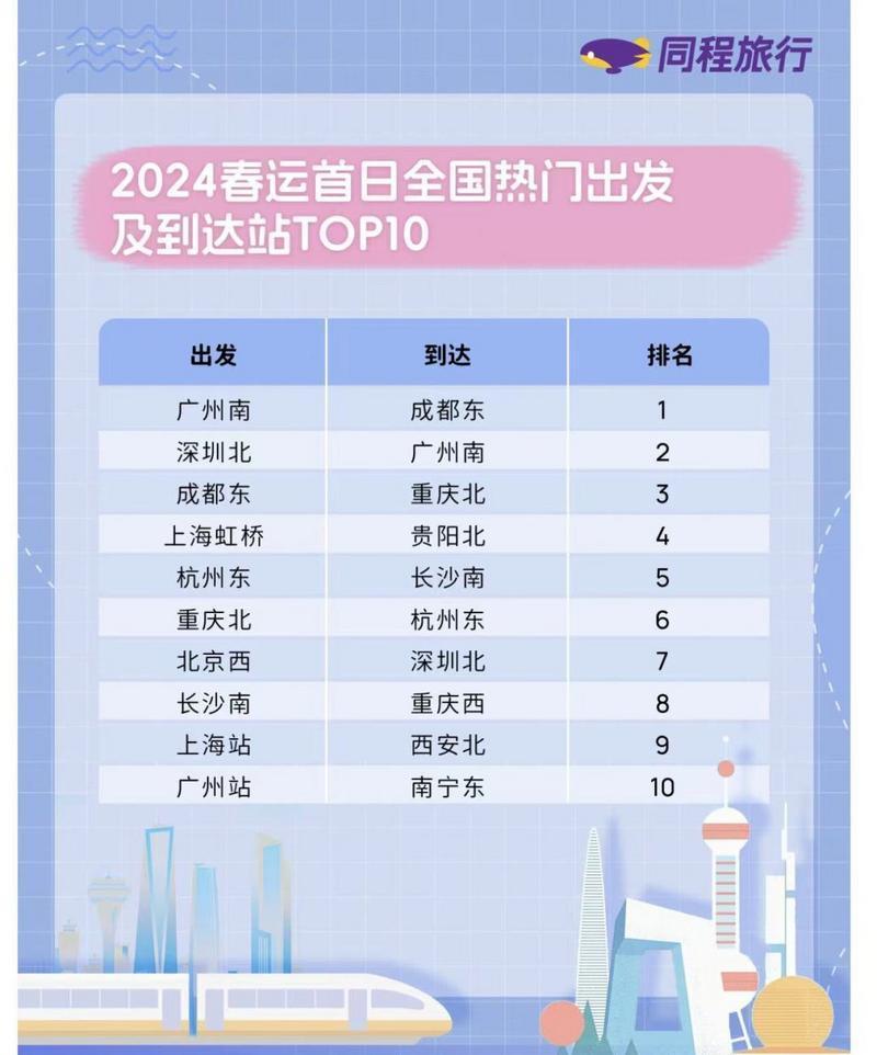1月26日,2024年春运正式启动。同程旅行平台数据显示,春运第一天全国出发客流量较大的铁路站点主要有:广州南、深圳北、成都东、上海虹桥、杭州东、重庆北、北京西、长沙南、上海站、广州站等。1月26日当天到达客流量较大的铁路站点主要有:成都东、广州南、重庆北、贵阳北、长沙南、杭州东、深圳北、重庆西、西安北、南宁东等。