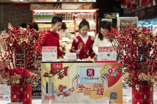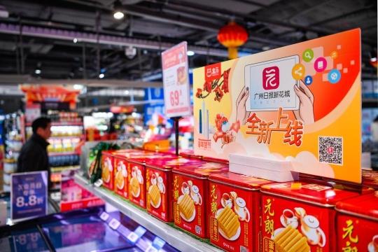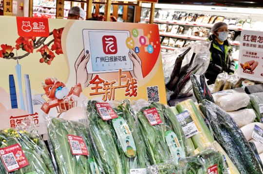 1月28日-2月3日,盒马鲜生位于广州、佛山、深圳、武汉、杭州、成都、长沙、西安等8座城市的24家门店齐齐“撑台”,在门店显眼位置摆放“广州日报新花城”客户端相关信息。一盒盒贴上了客户端二维码标签的连州菜心,陆续落入街坊们购物车中,被端上市民餐桌。下载“广州日报新花城”客户端,还可以抽取盒马年货卡。