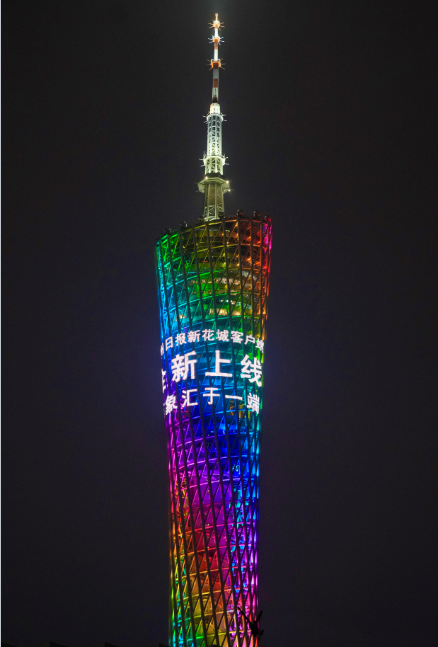 1月28日晚,“广州日报新花城客户端全新上线,万象汇于一端”,配合由“冰墩墩之父”曹雪设计的图形化文字客户端LOGO,在广州塔上缓缓滚动。