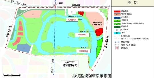 申请规划调整内容包括:AH070737地块用地性质为商业,用地面积6238平方米,绿地率25%,保持不变;建筑面积由4848平方米调整至6238平方米;容积率由0.78调整至1.0;建筑密度由50%调整至65%;建筑限高由10米调整至15米(临湖一线不超过10米);取消该地块原为海珠湖公园配建的社会停车泊位 (调至AHO70722地块)。