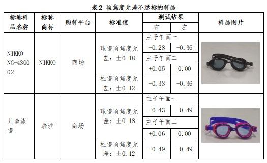 长期佩戴顶焦度偏差不合格泳镜会出现眼胀、模糊、眼内疼痛等视疲劳现象,也可能影响水下观察,造成一定安全隐患。2款样品顶焦度允差不符合中国轻工行业标准QB/T 4734-2014《游泳眼镜》的要求。