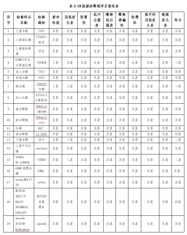 随着人们强身健体意识的提高,游泳健身已经成为当今时尚。泳镜是游泳运动中的必备器材,除了可以在水下视线不受影响,还可以防止池水入眼,造成眼部损伤。为帮助消费者科学选购游泳眼镜,广州市消费者委员会联合中国澳门消费者委员会对网络和门店销售的游泳眼镜开展比较试验,委托第三方质量技术机构广州检验检测认证集团有限公司进行测试。结果显示:测评的19款游泳眼镜样品总体表现良好,其中13款表现优秀评为五星,2款表现良好评为四星。