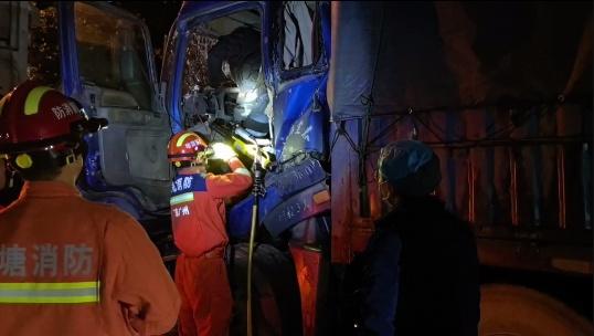 两货车相撞致油箱漏油,司机被困驾驶室