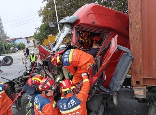 1月26日6时36分,南沙区宜发工业气体有限公司北37米处发生交通事故导致1人被困。6时53分,消防救援人员抵达事故现场,经侦查发现,现场为一辆厢式货车撞上一辆拖水泥桩的半挂车,货车车头因撞击发生严重变形,司机被“挤”在驾驶室内,好在被困司机意识清醒,但双腿被卡在方向盘与座椅之间无法动弹。