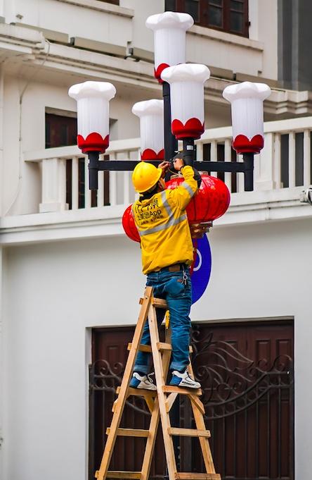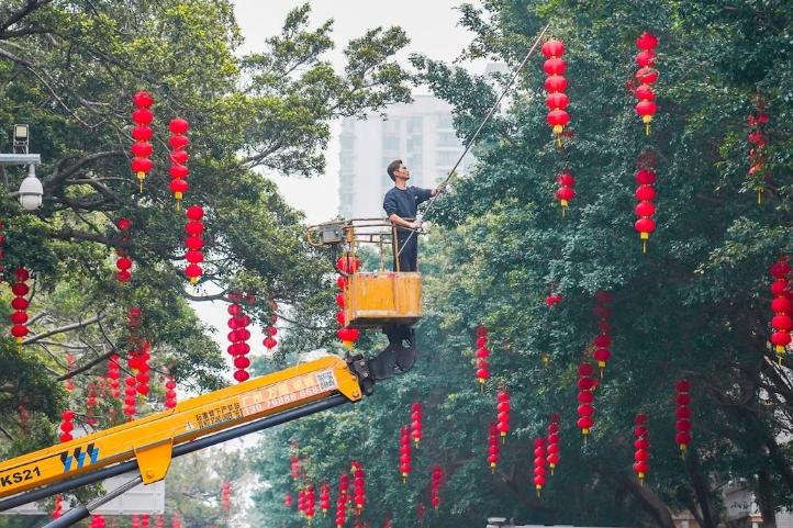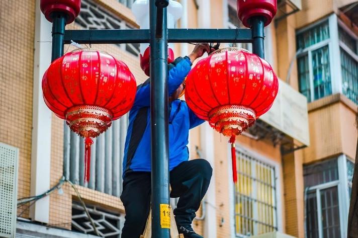 1月30日,记者走访了解放桥至人民桥路段,看见工人们正忙着将一盏盏红灯笼挂在树上、路灯上,为城市增添了不少年味。