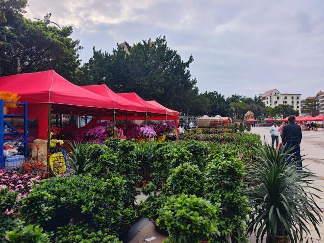 此外,今年华汇广场继续开设摆卖点,1月30日上午,华汇广场上鲜花档位已搭设完毕,各色各样的年花也已经到场。市民可搭乘南沙G4路到南沙碧桂园站下车前往选购年花。