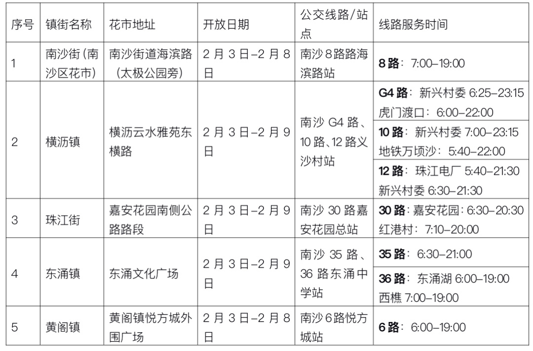 值得注意的是,珠江街花市举办期间,南沙30路双向临时取消停靠珠江街政务中心站,至2月10日起恢复停靠。市民前往珠江街花市可乘坐南沙30路到嘉安花园总站步行约400米到达花市。