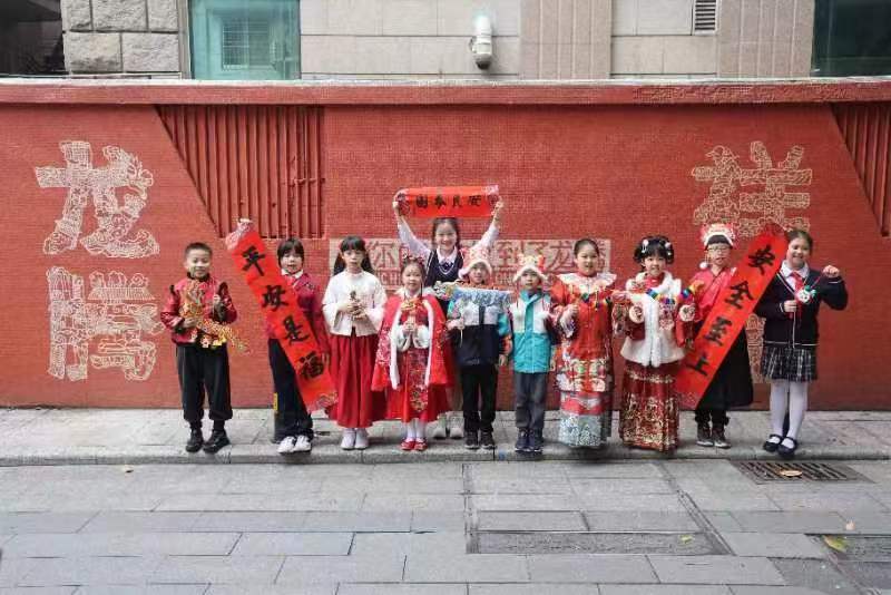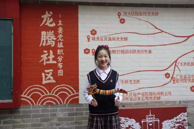 从位于越秀中路的社区入口前行50米,龙腾的主题墙——“想你的风吹到了龙腾”是本次研学活动的第一站。学子们和志愿者们纷纷摆出各种“龙腾虎跃”的造型,借网红墙的“龙腾”合影,寄寓新的一年龙腾盛世。还有学子展示自己的龙年作品,表达新年心愿,祈望国泰民安、学业有成。