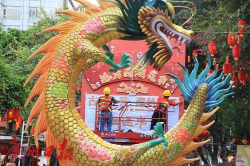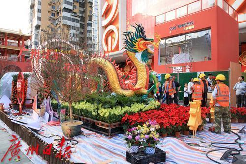 年近岁晚,一年一度的迎春花市即将开锣。2日,记者在越秀区北京路附近的西湖路花市看到,龙年花市的主牌楼和摊位均已搭建好,一些装饰正在完善收尾。