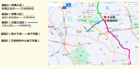 ①路段A:由番禺区政府至万博商务区,行驶在番禺大道北路段,途经冼庄互通立交,路段设有明显指示牌,跟随指引即可。