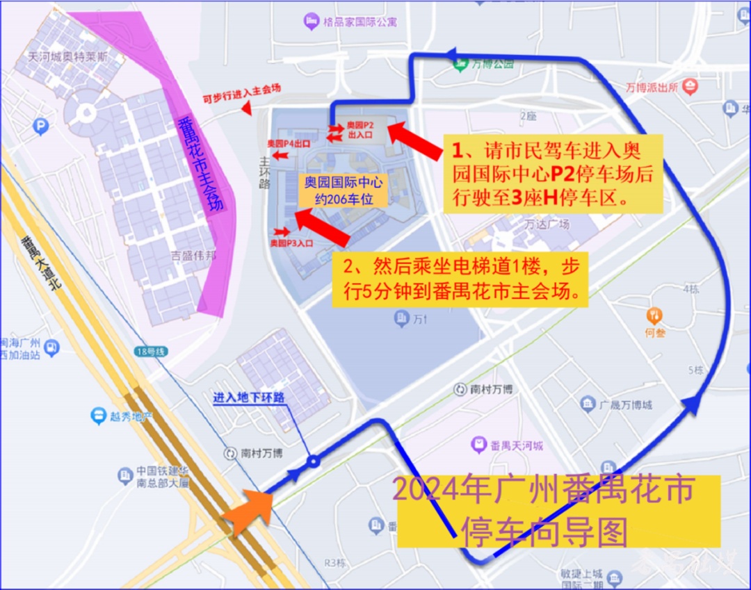 本次花市采用“以线下为主,线上线下相结合”的模式。主会场位于番禺区长隆万博商务区万博中心商业街,共设置档位238个,其中,花卉年桔标准档150个、工艺品档68个、公益档及非遗民俗档20个。一年一度的花市盛宴即将开幕,你是不是已经做好出发的准备了呢?在此,番禺区花市办贴心地为广大市民朋友们准备了一份交通出行指南,邀请大家一起前往花市盛宴!