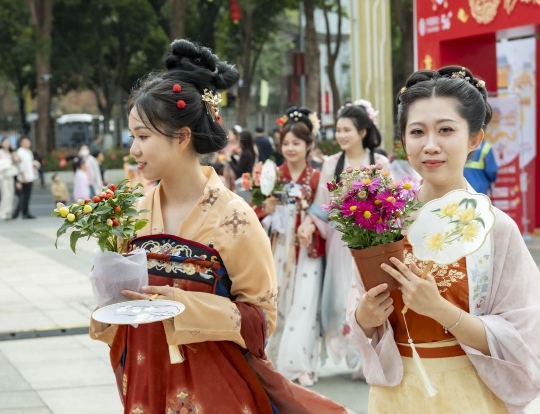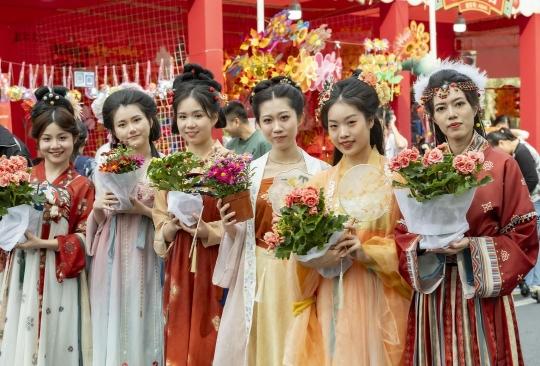 “穿汉服逛花市具有一种国风美学的仪式感,让我们更沉浸式体验传统文化,增强文化自信。”汉服小姐姐佳佳称,她来广州白云工作三年多,这是第一次逛花市,“没想到花市上有这么多有趣的活动。”
