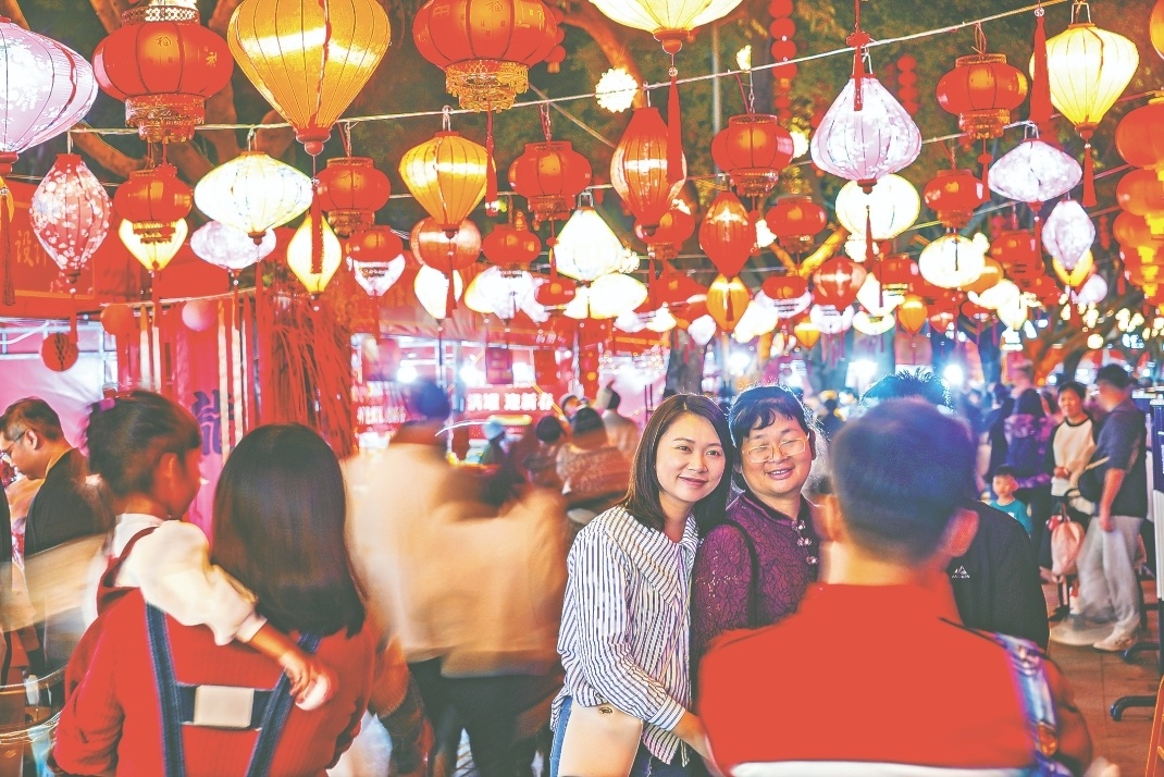 花市多彩的灯笼照亮游客的幸福时刻。